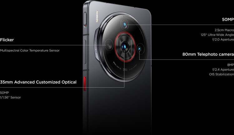 50M(35mm IMX906 OIS,1/1.56inch 1.0um, 4in1,1G+6P F/1.59,QPD)+50MUltra-Wide Angle(AF,OV50D,2.5cm,DFOV=120.4°,Mechanical Field of View 125°,13mm) +8M (3X,Hynix847 1/4.4inch 1.0um pixel size 5P F/2.4,80mm) ,Flicker